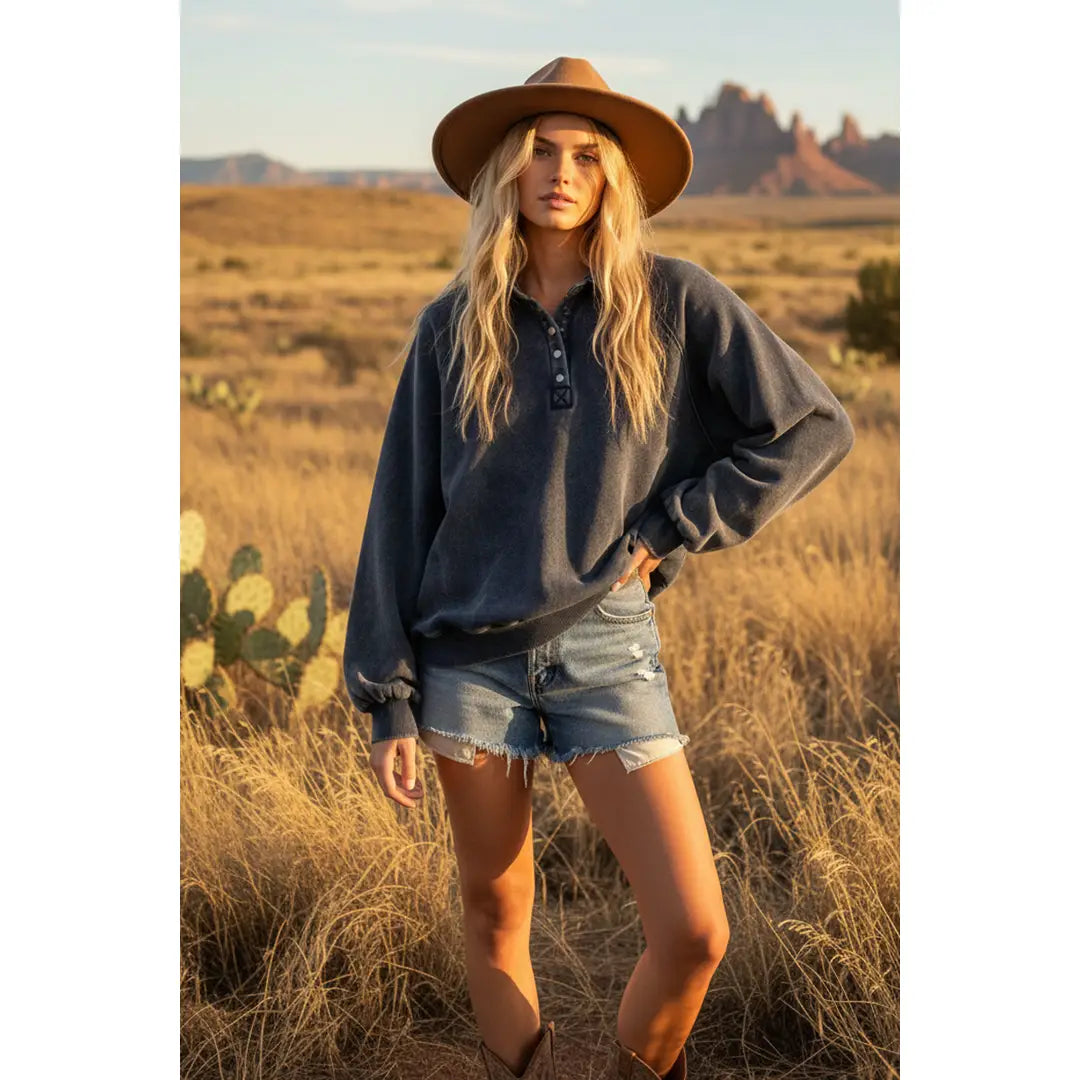 Elevate your casual wardrobe with this mineral wash navy half snap sweatshirt, designed for effortless layering and everyday comfort. The distinctive mineral wash creates a softened, vintage aesthetic while the half snap collar offers versatile styling options—wear it fully zipped for warmth or partially snapped for a relaxed, open neckline. Crafted from quality sweatshirt fabric, this piece transitions seamlessly from weekend lounging to casual outings. A wardrobe essential that combines timeless appeal with practical functionality.